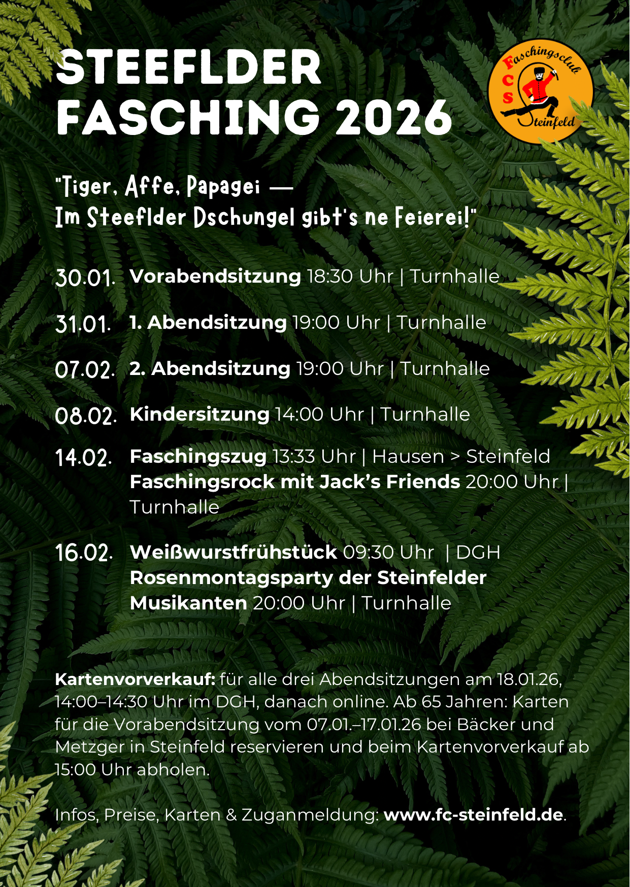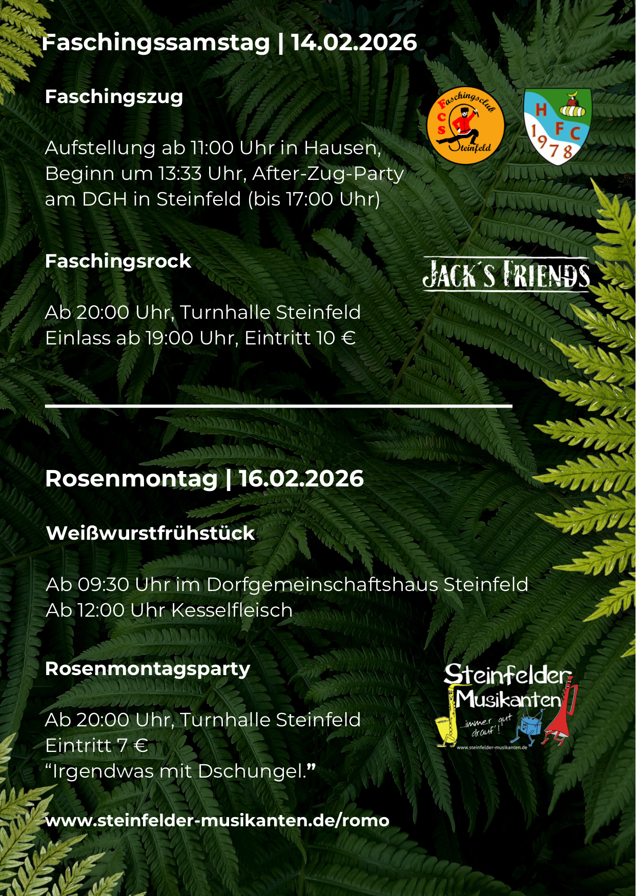Die Infos zum längsten Faschingszug der Welt – von Hausen nach Steinfeld findest du unter dem Menüpunkt Faschingszug.